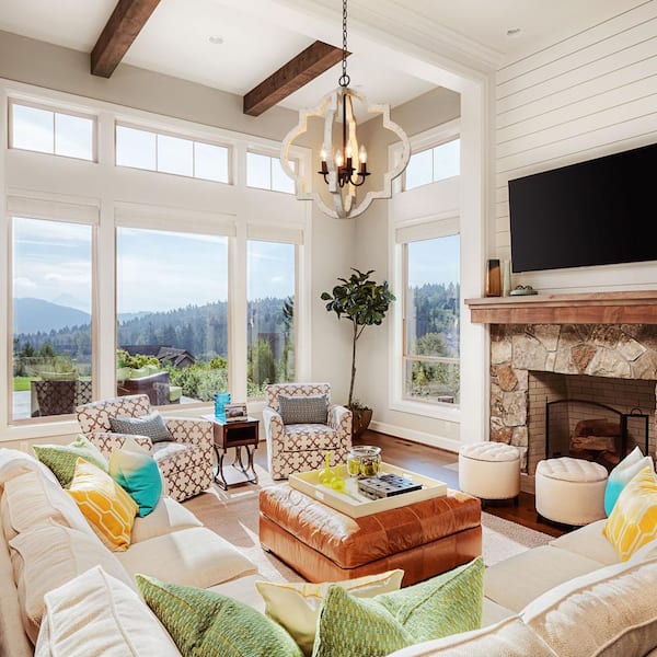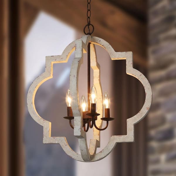 Modern Farmhouse Kitchen Chandelier 4-Light Distressed White Weathered Wood Adjustable Coastal Cage Pendant