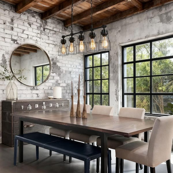 Modern Industrial Black Island Chandelier 5-Light Linear Large Hanging Pendant light with Geometric Metal Cage Shades