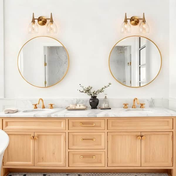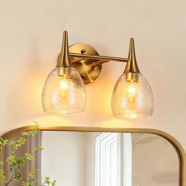 Modern Plated Brass 2-Light Vanity Light Contemporary Bathroom Wall Light with Oval Hammered Glass Shades for Bathroom