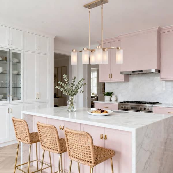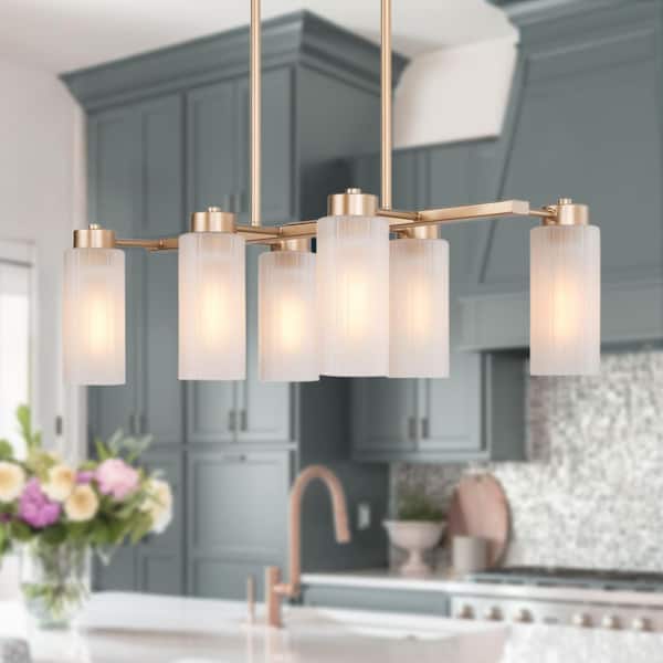 Modern Satin Gold Chandelier Linear Classic 6-Light Island Chandelier with White Frosted Glass Shades for Dining Room