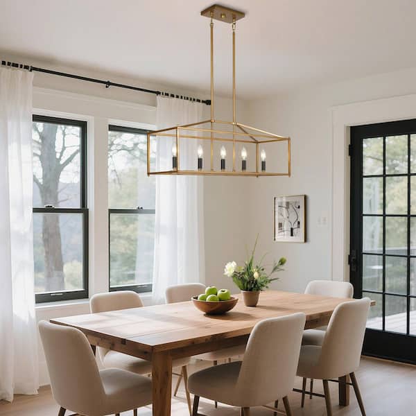Transitional 30 in. 5-Light Brushed Antique Gold Linear Chandelier with Rectangle Cage for Dining Room, Island Pendant