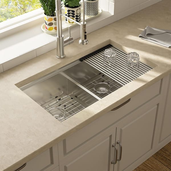 30 in. Undermount Double Bowl 16-Gauge Stainless Steel Workstation Kitchen Sink with Bottom Grids and Strainer