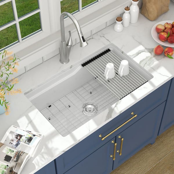 32 in. x 19 in. x 10 in. Single Bowl Ceramic Undermount Workstation Kitchen Sink with Accessories