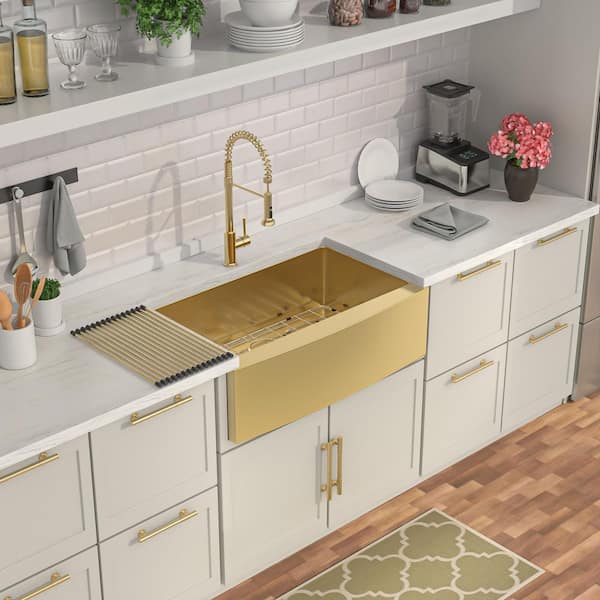 33 in. Gold Farmhouse Single Bowl 16-Gauge Stainless Steel Kitchen Sink with Basket Strainer