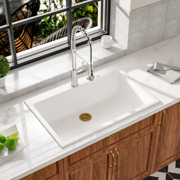 33 in. Topmount R15 Round Corner Quartz Composite White Drop-In Kitchen Sink Single Bowl with Accessories