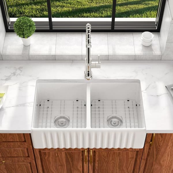 33 in.W x 18 in.D Double Bowl Ceramic Farmhouse/Apron Kitchen Sink with Sink Grid and Basket Strainer