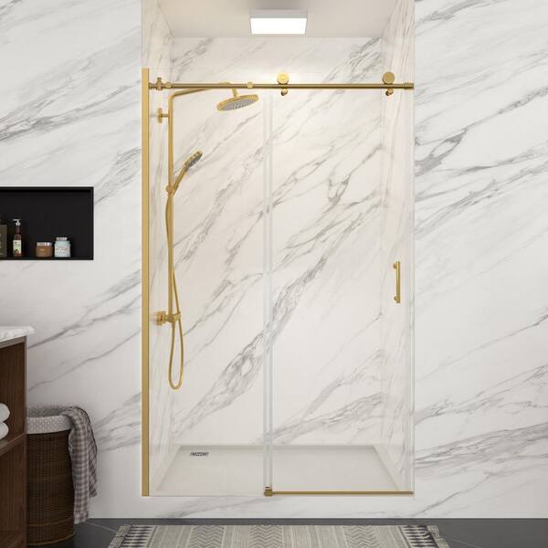 48 to 48 4/5 in. W x 76 in. H Framedless Single Sliding Shower Door in Gold with 5/16 in. (8mm) Tempered Clear Glass
