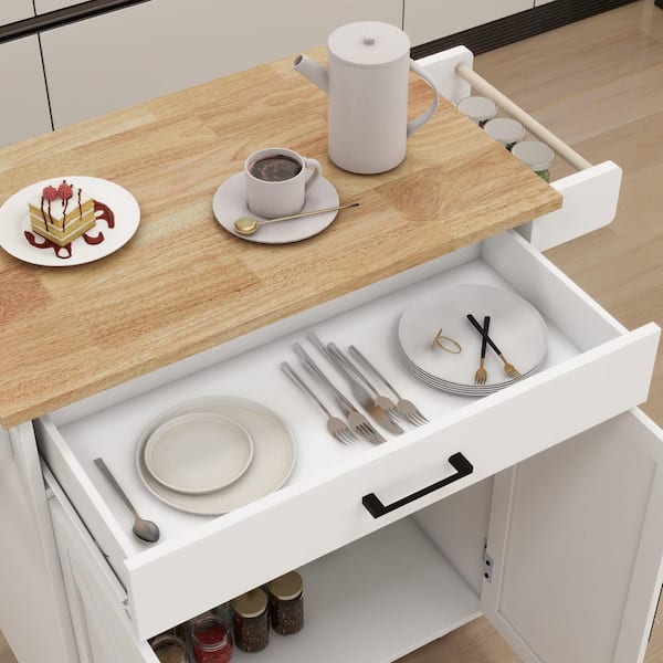 Wood White Rolling Trolley Cart 38 in. W x 13 in. D x 36 in. H Kitchen Island with Drawers