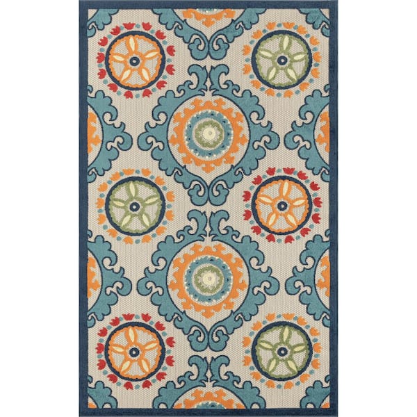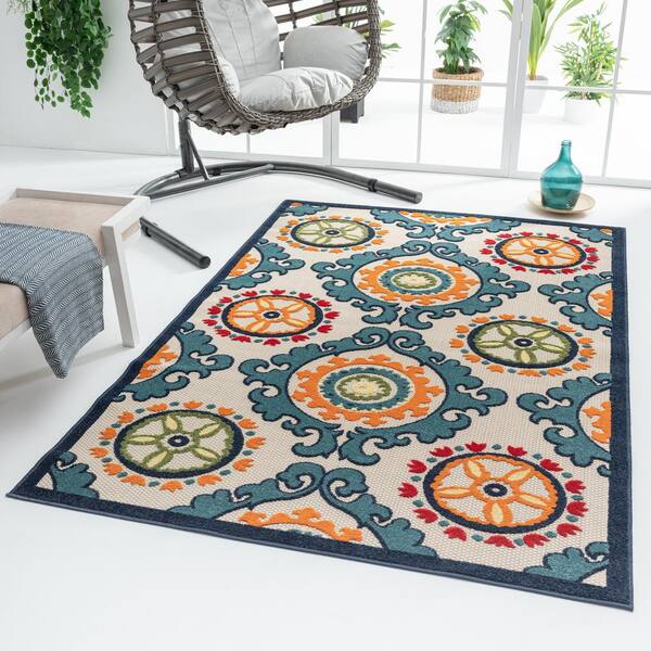 Clyde Suzani Blue/Multi 7 ft. 10 in. x 9 ft. 10 in. Medallion High-Low Polypropylene Indoor/Outdoor Area Rug