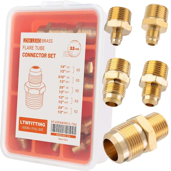 Tube OD (1/4 in. 5/16 in. 3/8 in. 1/2 in. 3/4 in.) x 1/2 in. Male NPT Brass Flare Connector Set (22-Pack)