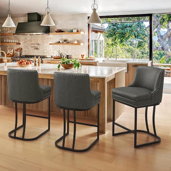 Aurora 26 in. Black Gray Faux Leather Upholstered Counter Height Bar Stool with Metal Frame Double Cushion Bar Stool