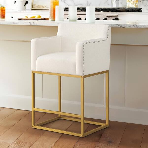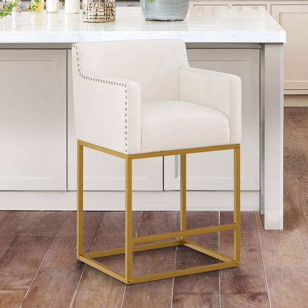 Hampton 26 in. Beige Modern Linen Upholstered Bar Stool Square Gold Metal Frame Counter Height Bar Stool