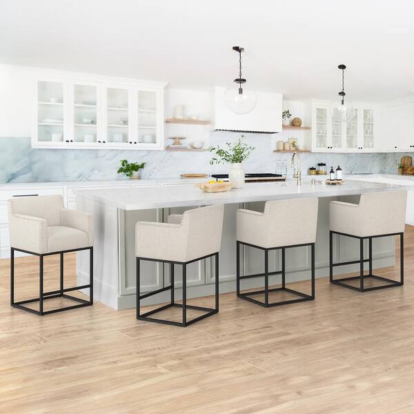 Hampton 26 in. Linen Modern Linen Upholstered Bar Stool Square Metal Frame Counter Height Bar Stool (Set of 4)