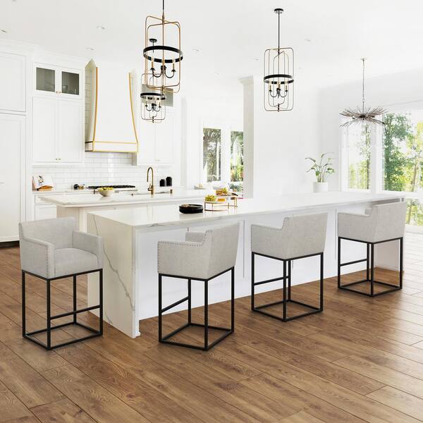 Hampton 30 in. Beige Gray Modern Linen Upholstered Bar Stool Square Metal Frame Counter Height Bar Stool (Set of 4)