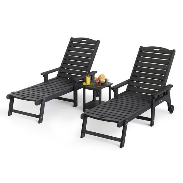 Hellen Keller Black 3-Piece HDPS Plastic Adjustable Outdoor Patio Reclining Chaise Lounge Chair Set with Side Table