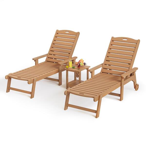 Hellen Keller Teak Brown 3-Piece HDPS Plastic Adjustable Outdoor Patio Reclining Chaise Lounge Chair Set with Side Table