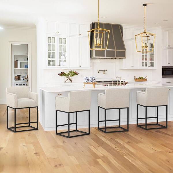Luna 26 in. Linen Fabric Upholstered Counter Bar Stool with Black Metal Frame Square Counter Stool Set of 6