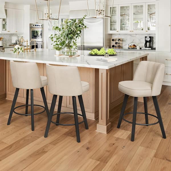 Paul 26 in. Beige Modern Fabric 360° Swivel High Back Barstool Solid Wood Counter Height stool (Set of 3)