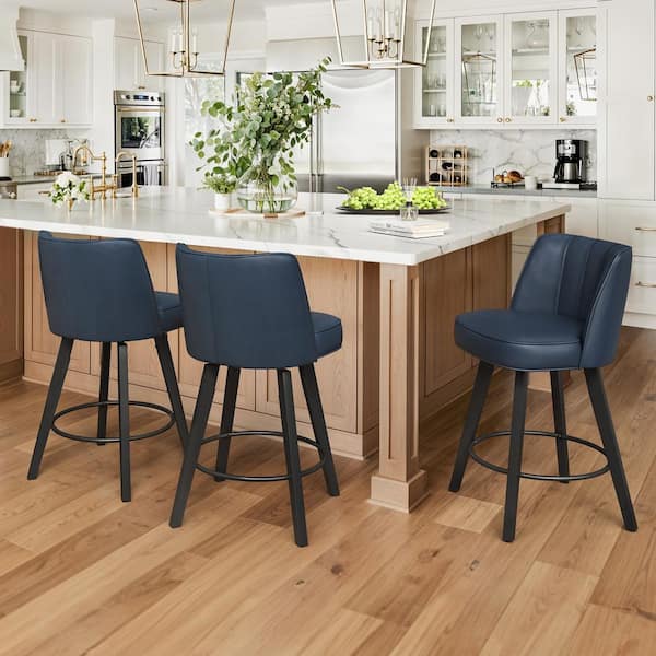 Paul 26 in. Blue Modern Faux Leather 360° Swivel High Back Barstool Solid Wood Counter Height stool (Set of 3)