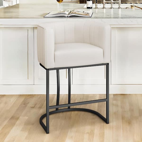 Siska 26 in. Modern Beige Fabric Upholstered Counter Stool with Black Metal Frame Barrel Counter Bar Stool