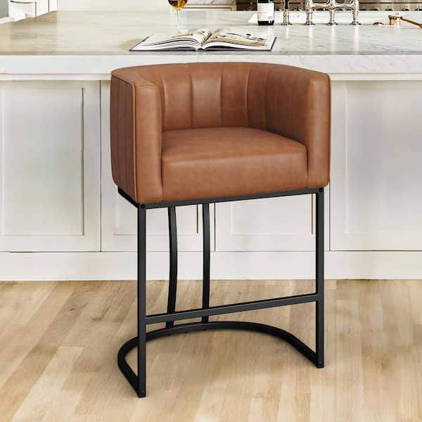 Siska 26 in. Modern Brown Faux Leather Upholstered Counter Stool with Black Metal Frame Barrel Counter Bar Stool