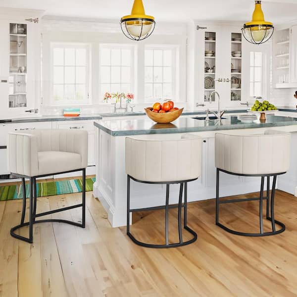 Siska 26 in.Modern Linen Fabric Upholstered Counter Stool with Black Metal Frame Barrel Counter Bar Stool Set of 3