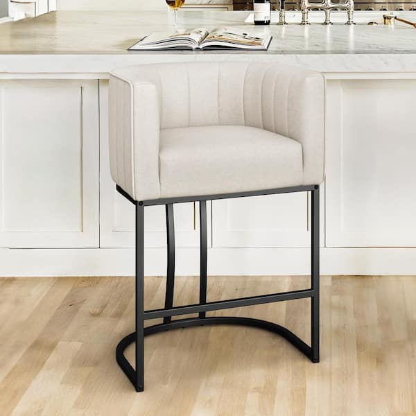 Siska 26 in. Modern Linen Fabric Upholstered Counter Stool with Black Metal Frame Barrel Counter Bar Stool