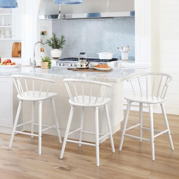 Winson Windsor 24 in. White Solid Wood Bar Stool for Kitchen Island Counter Stool with Spindle Back Set of 3