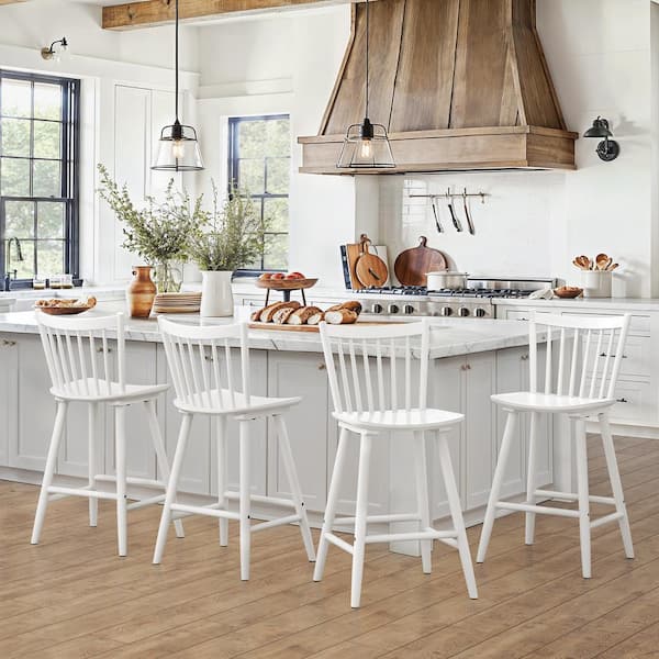 Winston 24 in. White Classic Windsor Barstool Solid Wood Farmhouse Counter Height Stool with Spindle Back (Set of 4)