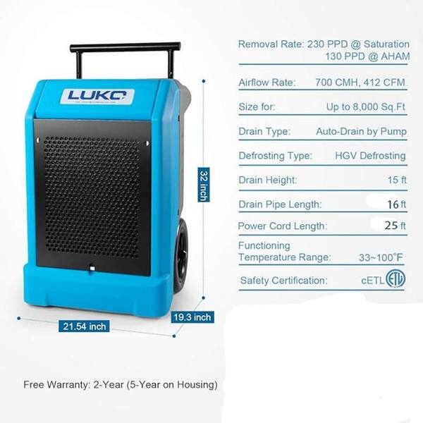230 pt. 8,000 sq.ft. Bucketless Commercial Dehumidifier in. Blue with Pump, Automatic Defrost for Commercial Places