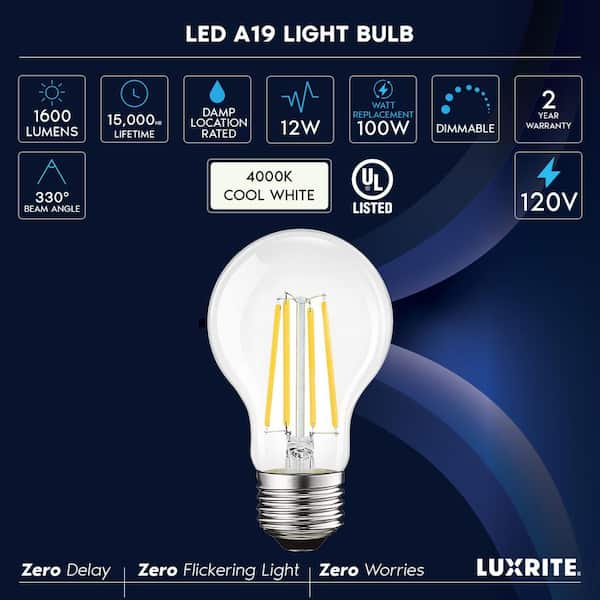 100-Watt Equivalent A19 1600 Lumens Dimmable E26 Edison LED Light Bulb 12-Watt Damp Rated UL 4000K Cool White (6-Pack)