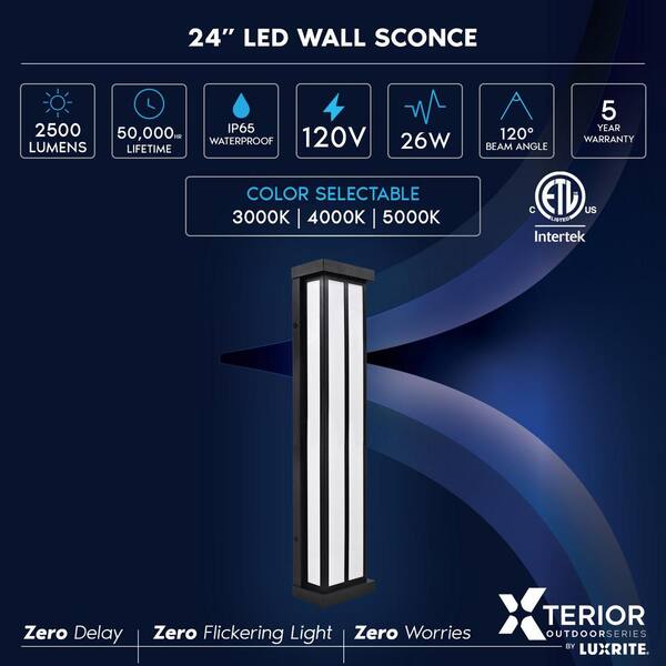 24 in. Black Outdoor LED Wall Sconce Light Fixture 3CCT 3000K/5000K 26-Watt ETL Listed IP65 Waterproof (2-Pack)