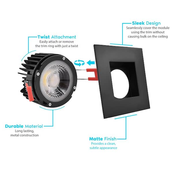 4" Square LED Recessed Light J-Box 15W 5 Color Selectable 1100 Lumens Dimmable Wet Rated Black Trim 4 Pack