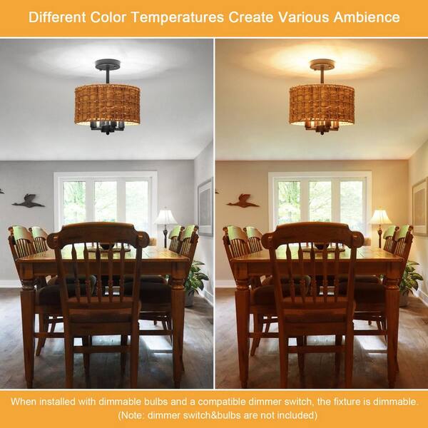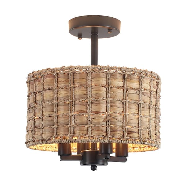 11.81 in. 4-Light Black Bohemian Drum Semi-Flush Mount Light with Hand Woven Shade