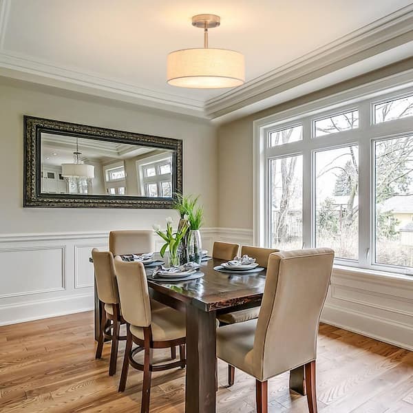 12.6 in. 3-Light Nickel Farmhouse Drum Semi-Flush Mount Light with Linen Cover