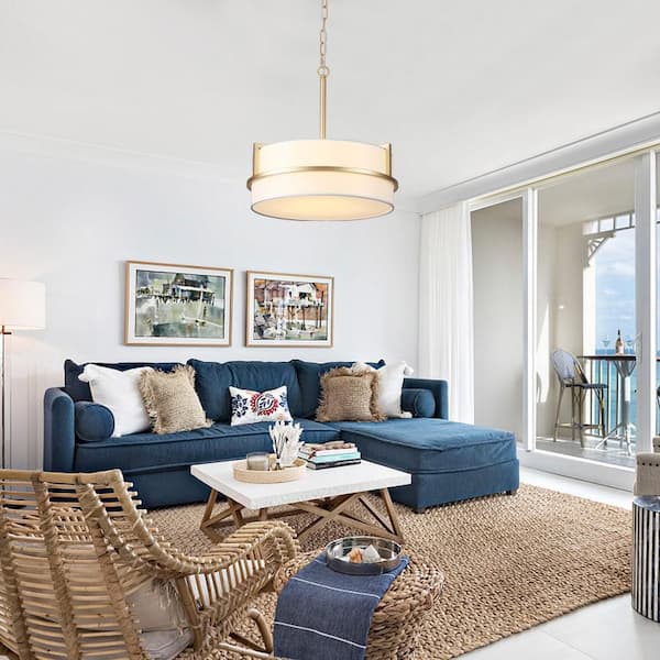 15.74 in. 3-Light Spray Gold Modern Circle Chandelier with White Fabric Drum Shape for Kitchen Island Restaurant Bar