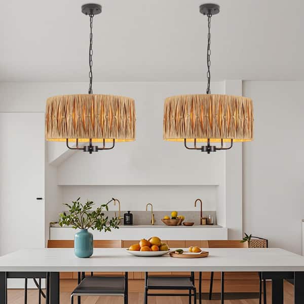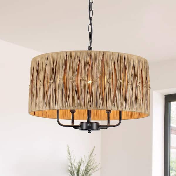 19 in. 5-Light Black Bohemian Raffia Dimmable Chandelier with Hand-Woven Drum Shade for Kitchen Dining Room Entryway
