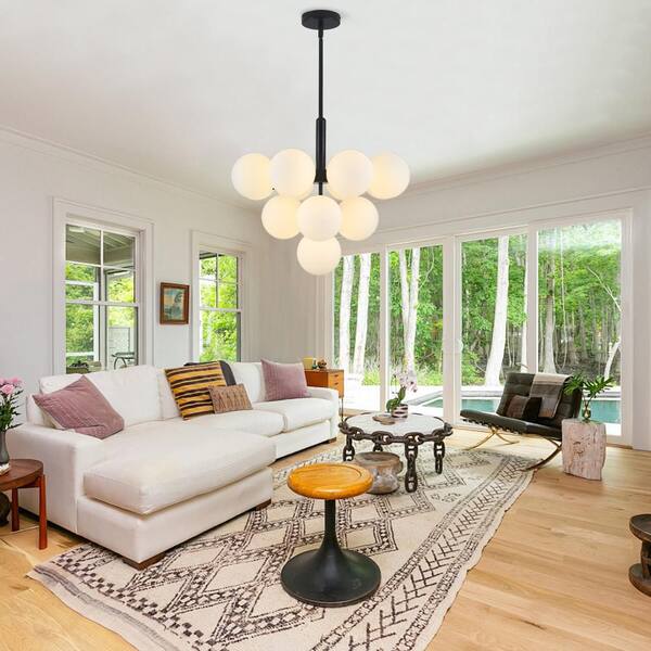 22. 44 in. 13-Light Black Mid-Century Sputnik Atomic Tiered Bubble Cluster Chandelier with Opal Glass Globe for Kitchen