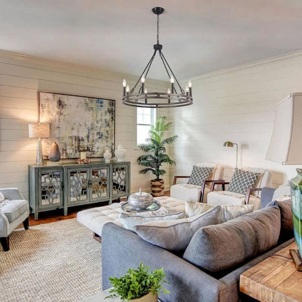 26 in. 8-Light Imitation Wood Grain Retro Candle Wagon Wheel Chandelier with 59 in. Matel Chain for Bedroom Hallway Bar