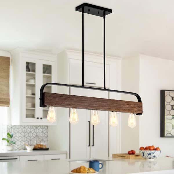 35.8 in. 5-Light Black/Brown Vintage Farmhouse Kitchen Island Linear Pendant with Wood Accents, No Bulbs Included