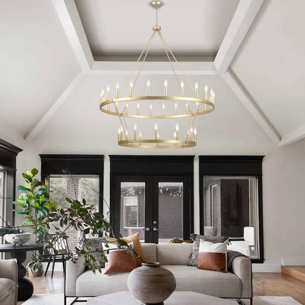 36-Light 2-Tiers Imitation Copper & Gold Candle Style Wagon Wheel Chandelier Round Industrial Pendant Lighting