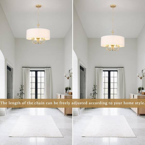 5-Light Gold Candlestick Chandelier with Beige Linen Drum Shade