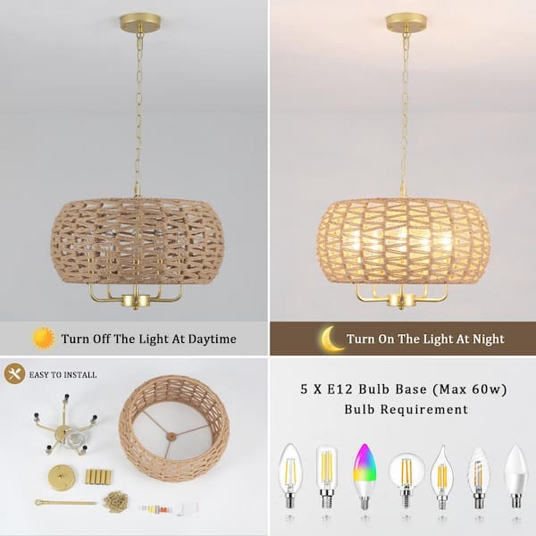 5-Light Gold Farmhouse Chandelier with Hand Woven Shade for Dining Room with no bulbs included
