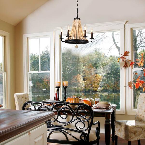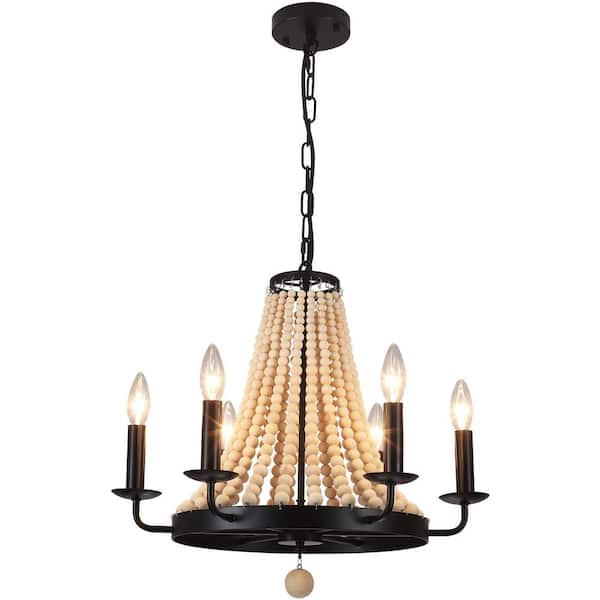 6-Light Black Aged Wood Beaded Candle Style Wagon Wheel Farmhouse Chandelier