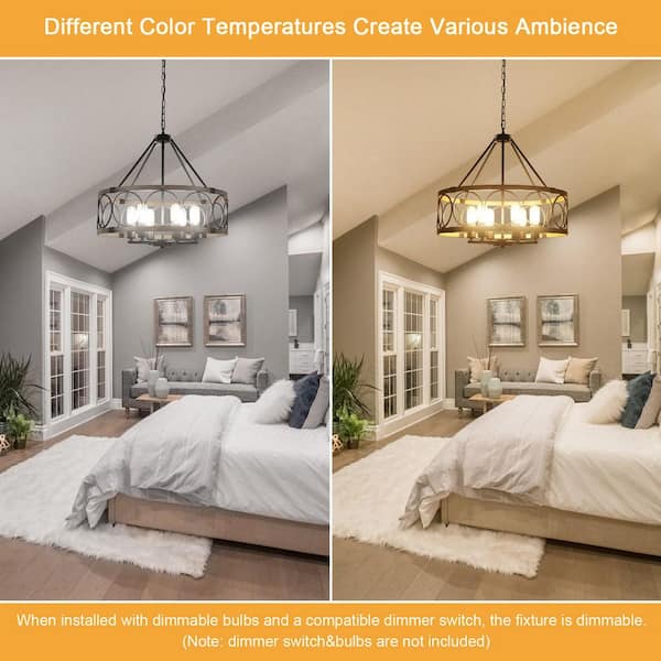 6-Light Black and Imitation Wood Grain Farmhouse Chandelier with Metal Shade for Dining Room