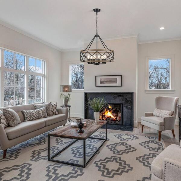 6-Light Black and Imitation Wood Grain Farmhouse Chandeliers Drum Chandelier with Metal Shade for Dining Rooms