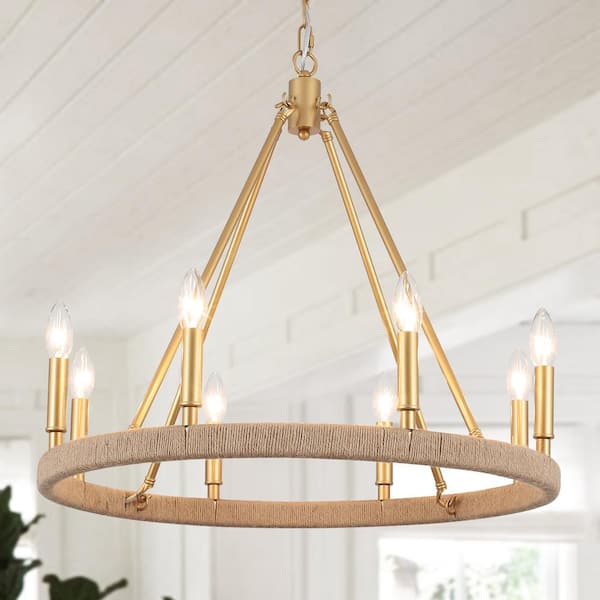 Elinka 8 Light Gold Rope Farmhouse Wagon Wheel Candle Style Chandelier for Living Room Kitchen Dining Room Foyer