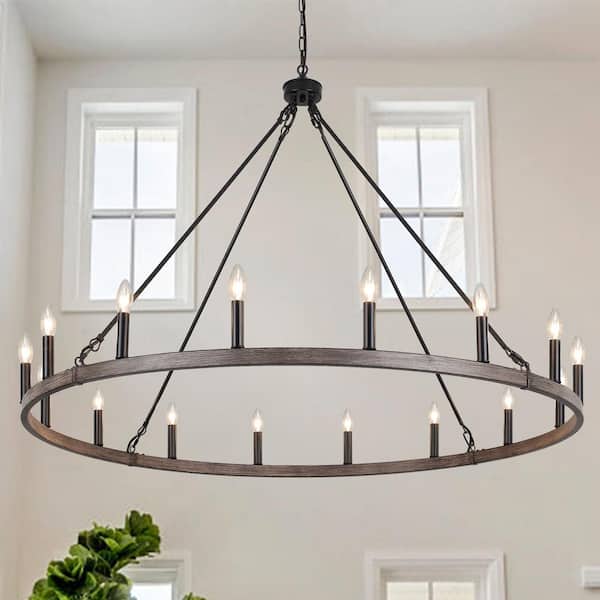 Janiaha 47.24 in. 16-Light Black/Wood Large Farmhouse Candle Wagon Wheel Chandelier for Living Room Pendant Lighting