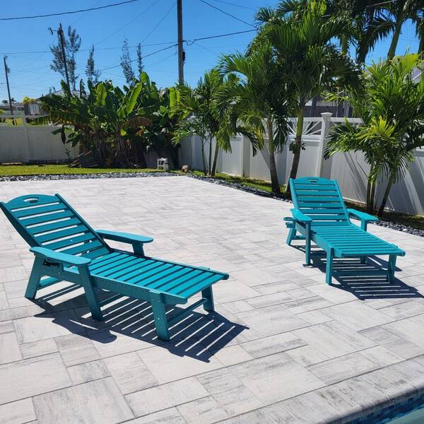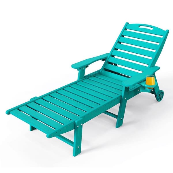Lake Blue Plastic Outdoor Chaise Lounge with Wheels and Cup Holder