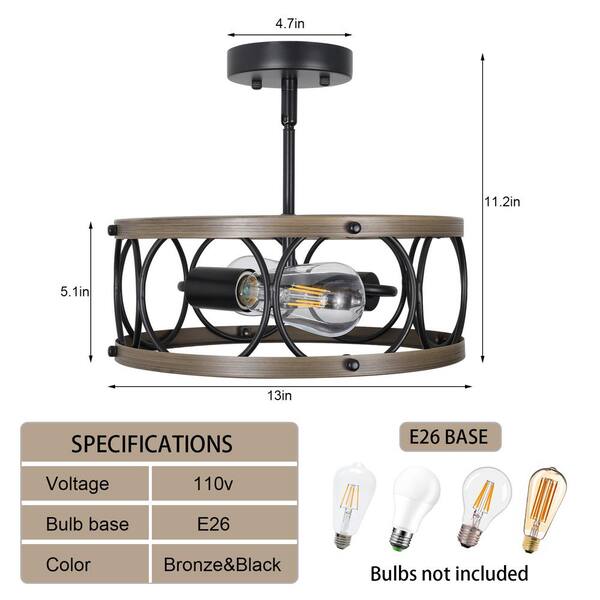 13 in. 2-Light Farmhouse Chandelier Black Semi-Flush Mount Light Fixtures with Metal Drum Shade